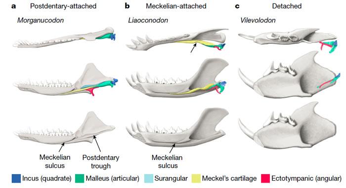 a,通过下颌后方骨骼与下颌相连的中耳(postdentary-attached middle ear); b, 通过麦氏软骨与下颌相连的中耳( Meckelian-attached middle ear); c, 与下颌分离的中耳( detached middle ear)