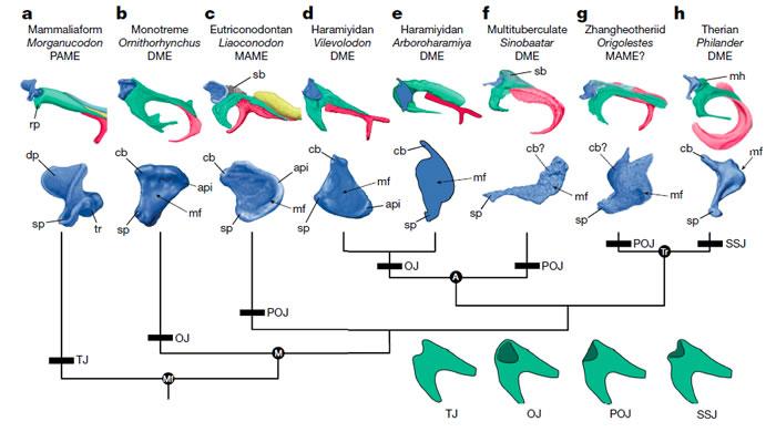 这种听小骨上下叠覆的连接方式,首先出现于中生代哺乳动物各个支系的早期成员,在现生鸭嘴兽(单孔类)、有胎盘类和有袋类的个体发育早期阶段也可见及,是中耳听小骨从具有咀嚼和听觉双重功能过渡到单一听觉功能的关键一环。这种叠覆型的连接,在白垩纪的真三尖齿兽,多瘤齿兽和对齿兽类群中更进一步,砧骨相对于锤骨位置后移形成部分叠覆。之后的漫长岁月里,这两块小骨与下颌完全分离,并不断缩小进入中耳且专职听力,成为真正的哺乳动物听小骨。由此可见,是自然选择,而不是下颌咀嚼功能决定了中耳的演化。