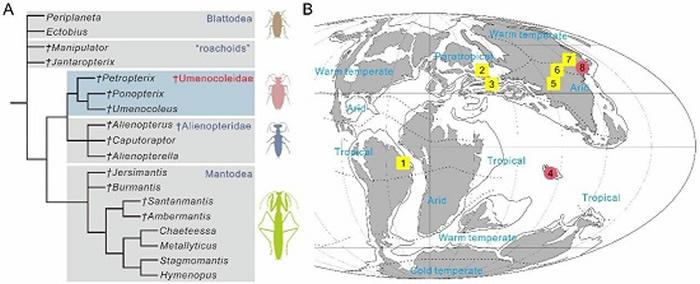 玉门鞘蠊的系统发育位置示意图与其在早白垩世的分布图