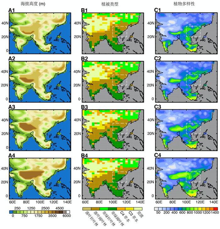 注:青藏高原从南往东北方向生长,中国东南部常绿阔叶林的成分不断增加,尤其是青藏高原的北部羌塘地块及松潘-甘孜地块隆起,东亚植被转变成以常绿阔叶林主导,植物多样性增加非常明显。