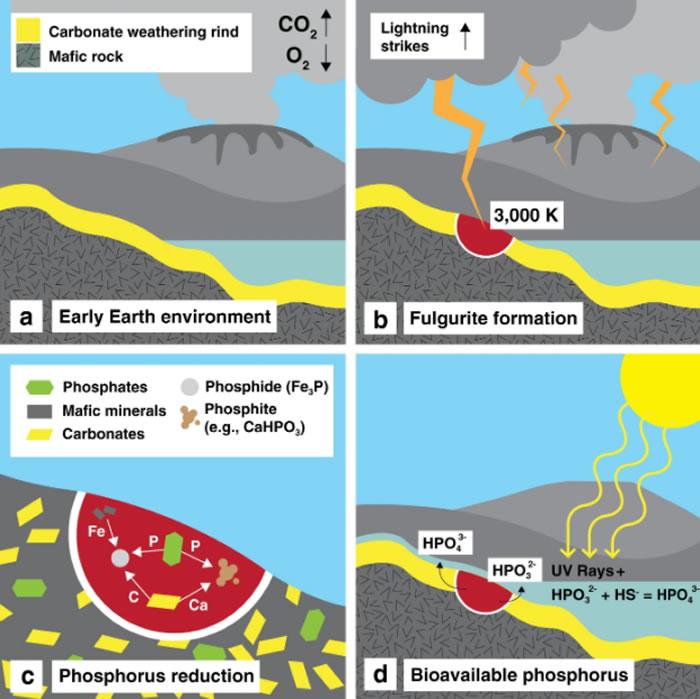 研究小组模拟了早期地球的状况,发现它每年会经历1亿到10亿次雷击。这当然会产生大量的生物可利用的磷--每年会产生高达1000千克的磷化物和10000千克的亚磷酸和次亚磷酸。