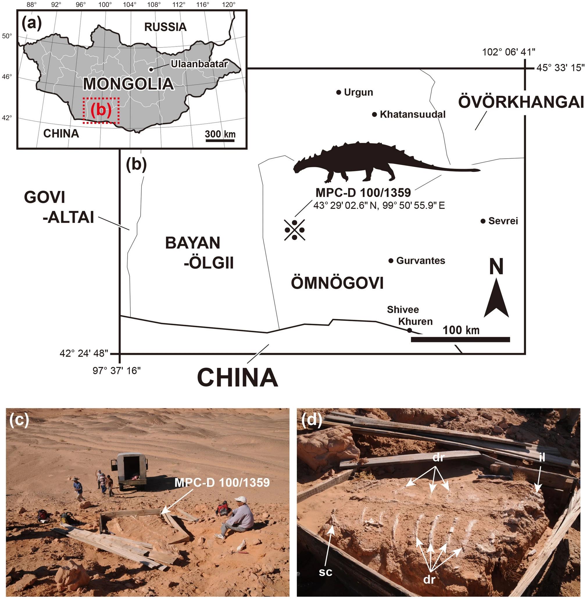 此次,韩国首尔大学研究团队从上世纪70年代在蒙古南戈壁沙漠发现的“Baruungoyot”组一个地层中,发掘到了骨骼残骸并标号为MPC-D 100/1359。研究团队分析认为,MPC-D 100/1359的多个解剖学特征或提示这是一只甲龙,且它曾适应了挖土——这只甲龙的前足骨骼呈浅弧形排列,这是能用来挖掘松软土的证明。