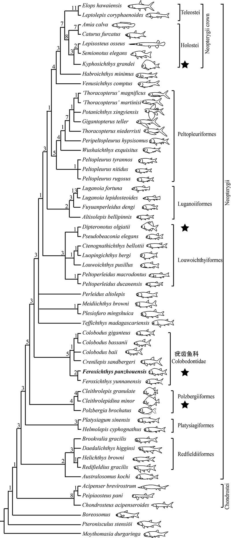 新重建的新鳍鱼类分支谱系图,显示“驼背体型”在新鳍鱼类中的四次平行演化