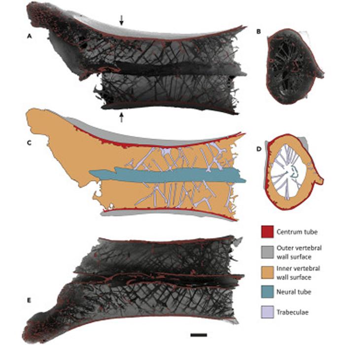 该研究第一作者Cariad Williams说:“最令人惊讶的是,它的内部结构保存完好,当看到错综复杂的骨小梁时,我们可以看到其排列成螺旋状,在椎管上下移动,像自行车轮辐条一样相互交叉。”
