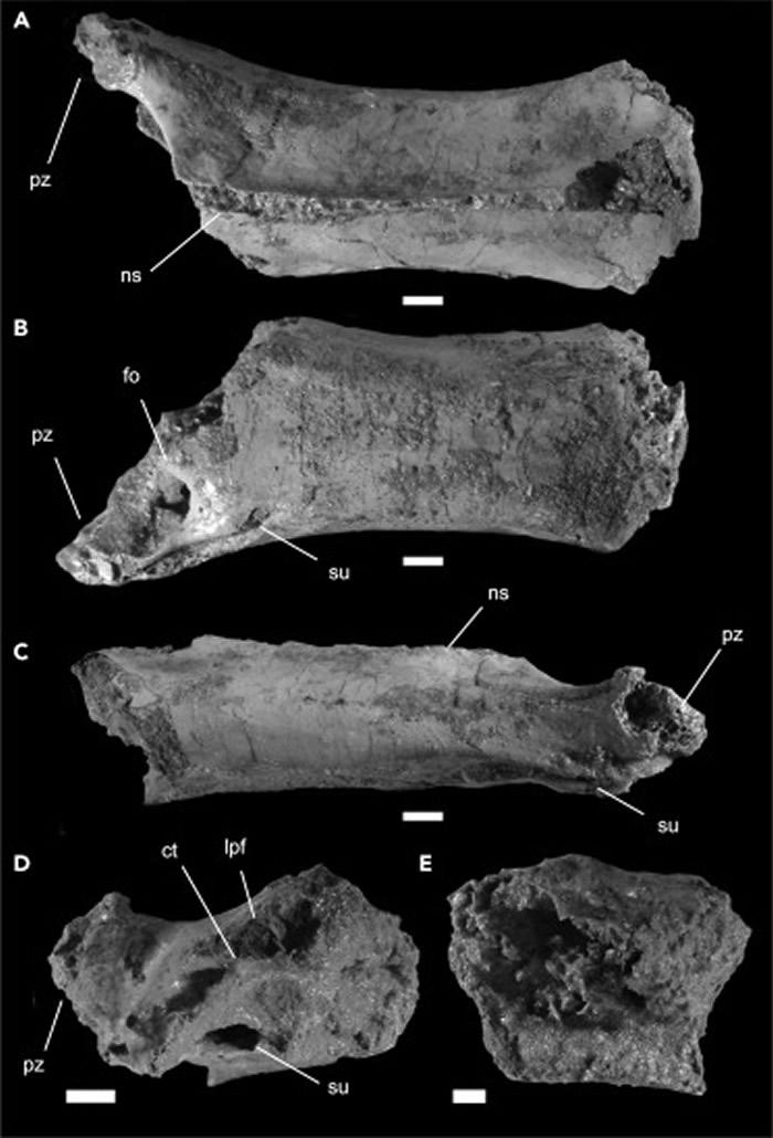 “我们最重要的发现之一是椎体的交叉排列。”英国朴茨茅斯大学的Dave Martill说,“它不像以前在动物脊椎上看到的任何东西,骨小梁像自行车轮的辐条一样呈放射状排列,并沿着椎骨纵向螺旋状排列。它们甚至像辐条一样交叉。”