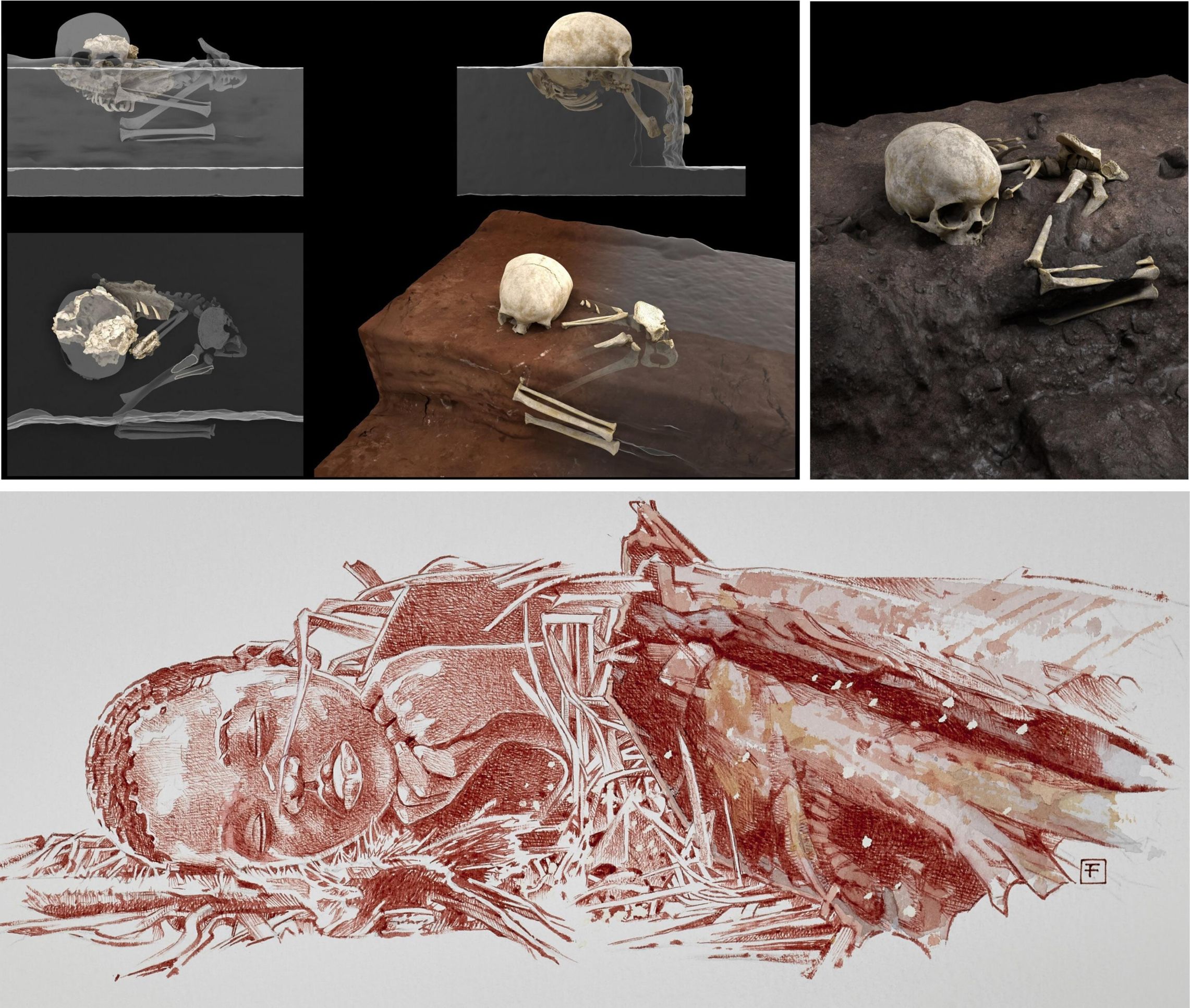 报道指出,这具人类遗骸于2017年出现在一个位于肯尼亚海岸附近的洞穴考古遗址。研究团队在布尔戈斯展开修复工作,逐渐在土块中发现了一个儿童的遗骸。团队最终得出结论:大约7.8万年前有人挖掘了一个洞,把一个儿童尸体以右侧卧的姿势放在洞里,随后仔细掩埋起来。这些遗骸的排列方式也表明这个大约3岁的小男孩在坟墓里裹着一块裹尸布,并枕着一个类似枕头的东西。