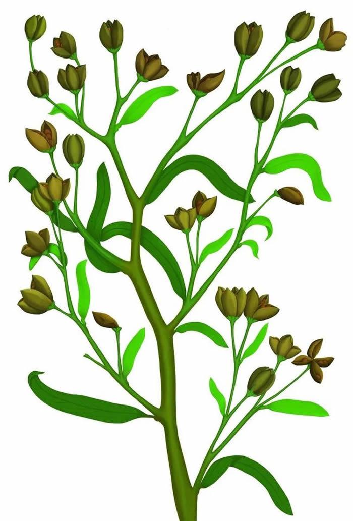 柳叶甘肃果(Gansufructus saligna)化石标本保存于中沟组上段灰绿色泥岩中,难能可贵的是植株保存完整,除地下部分以外,化石上几乎完整保存植物体的茎、叶以及果序,为早期被子植物形态研究提供了宝贵的材料。从形态上看,柳叶甘肃果植株直立,具三到四级分枝,枝叶互生,叶片形似柳叶,叶脉微弱,低级脉序,主脉明显,二级脉羽状,三级脉网状。果序圆锥状,果实开裂,由四个基部合生的心皮组成,每个心皮内包裹3至5枚种子,心皮基部还可见明显的花被残留,具有典型的双子叶被子植物的特点。