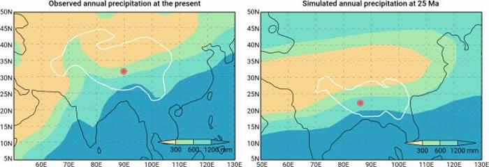 古地理位置变化解释藏中伦坡拉盆地晚渐新世-早中新世亚洲季风的发生。左图显示青藏高原及其周边现代观测的年降水量分布,右图显示基于古气候模拟获得的25 Ma时期年降水量分布。图中蓝色至黄色阴影指示年降水量变化,封闭的白色廓线为青藏高原1500 m等高线,红点指研究点位置