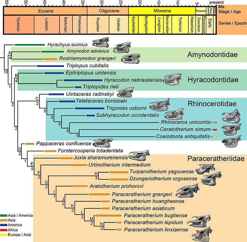 (化石网整理)据中新网北京6月17日电(记者 孙自法):作为地球历史上已知生存过的最大陆地哺乳动物,巨犀最早发现于亚洲,其从始新世中期4200万年前出现到中新世早期2100万年前灭绝的演化关系研究一直备受关注。