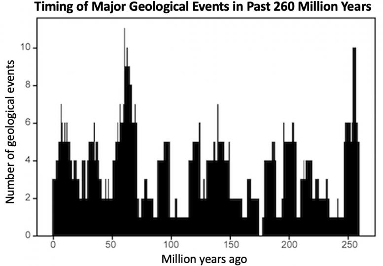 然而,放射性同位素测年技术有了很大的改进,地质时标也发生了变化,导致了关于过去事件时间的新数据。Rampino和他的同事利用现有的最新年代测定数据,汇编了过去2.6亿年来主要地质事件的最新记录,并进行了新的分析。