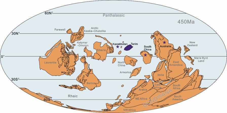 晚奥陶世凯迪期古地理复原图,示意塔里木板块与哈萨克斯坦密切的动物群联系
