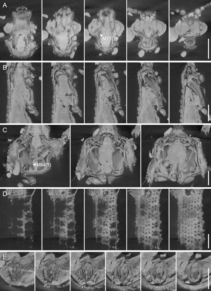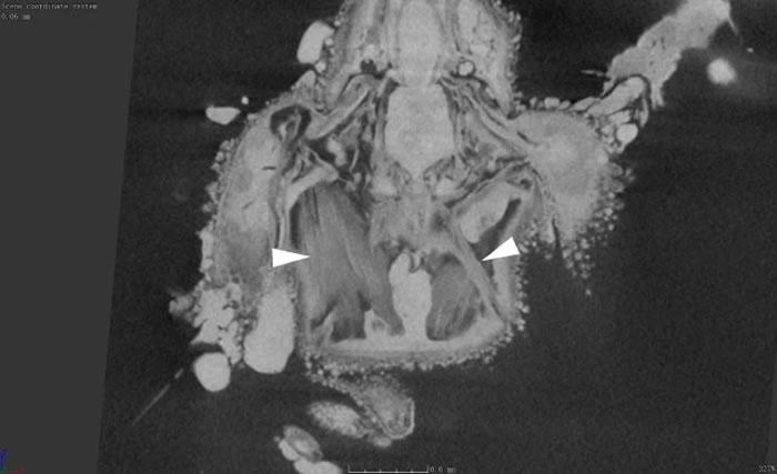 领导此项研究的中科院南古所研究员蔡晨阳介绍,他们在对缅甸琥珀中的原鞘亚目甲虫开展分类系统学研究时,在副齿边眼甲属一新种中,首次发现了甲虫体内原位立体保存的肌肉。通过显微CT扫描,研究人员发现,该枚薄脊副齿边眼甲标本保存有较好的内部软组织结构,其中后胸部分的肌肉保存最为完好,可以清楚地看到条纹状的肌肉组织。