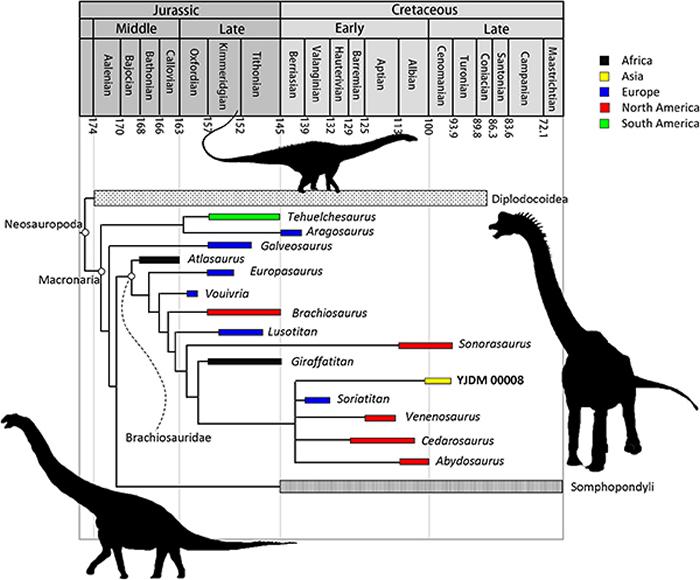 在演化上,腕龙类代表泰坦巨龙形类的一个早期分支,是多孔椎龙类的姐妹群。后者包含我国早白垩世常见的盘足龙类。论文第一作者廖俊棋表示: “过去也有许多蜥脚类化石发现曾被作为支持腕龙类分布于亚洲的证据,但这些研究不是被后续研究推翻,就是仅提供了模糊的证据。”