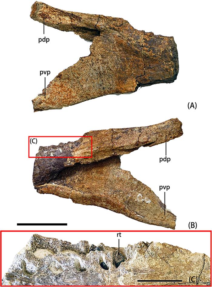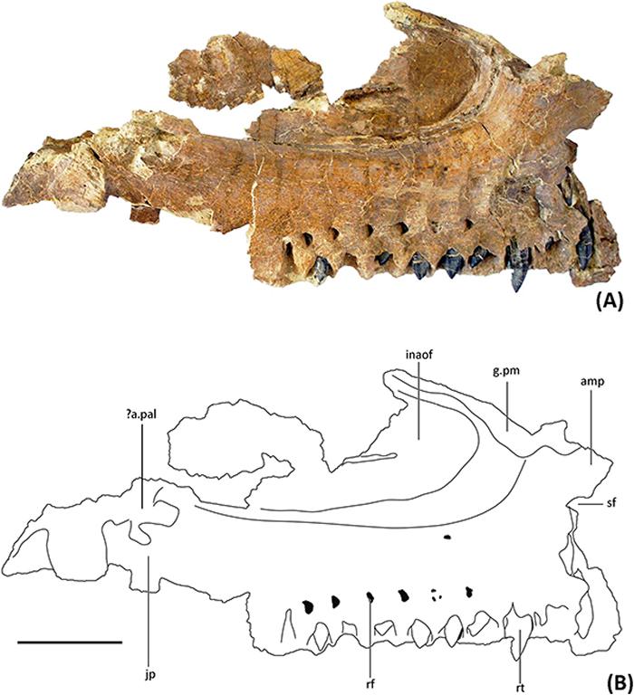 延吉蜥脚类上颌骨标本YJDM 00008照片及描线图。(廖俊棋 摄影、绘图)