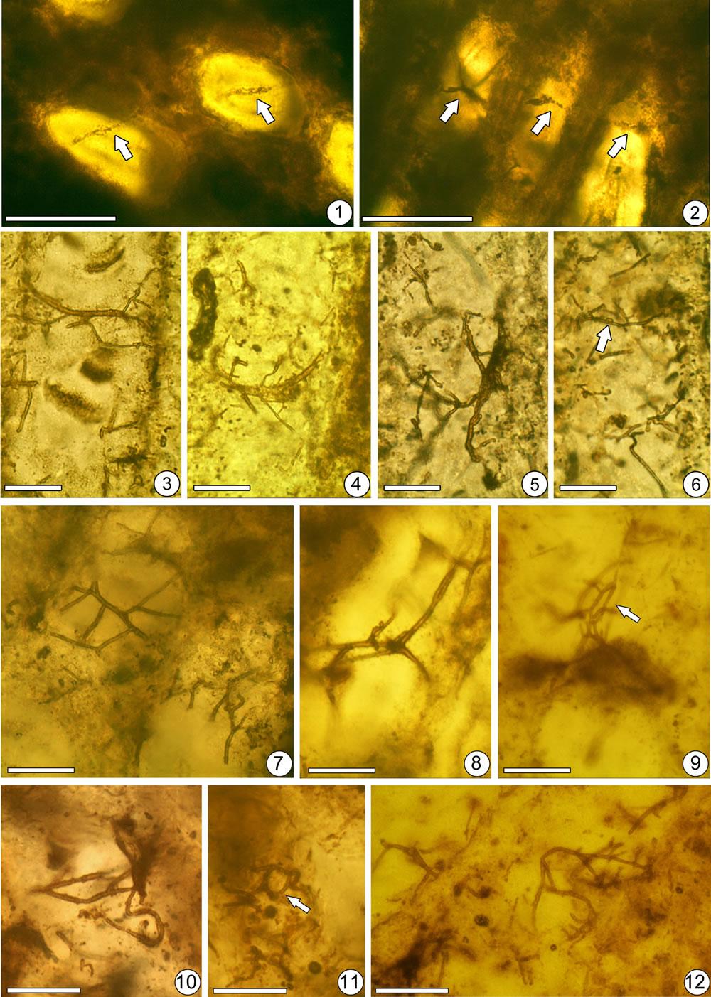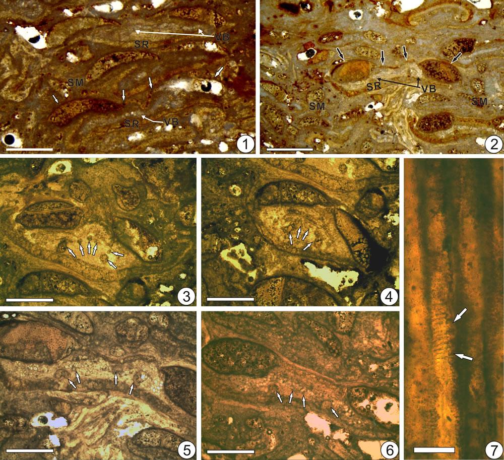 本次新发现的化石采自辽西北票地区的中侏罗统髫髻山组,距今约1.6亿年。化石保存为硅化标本,具有精美的解剖构造,由髓、木质部圆筒、二分的皮层及宿存的叶柄基组成。最显著的特征为其叶柄基具一高度特化的异质硬化环,叶柄基硬化环近轴端由薄壁纤维构成;而其远轴端具一呈“哑铃状”的厚壁纤维带,明显有别于现生及化石绒紫萁属植物。更为重要的是,研究团队在这些根茎标本中还发现了大量罕见保存的精美菌丝化石。基于菌丝形态特征及宿主存在腐朽特征,研究人员推断其是一类木材腐朽菌化石。这也是我国首次在紫萁科根茎化石中发现真菌化石。
