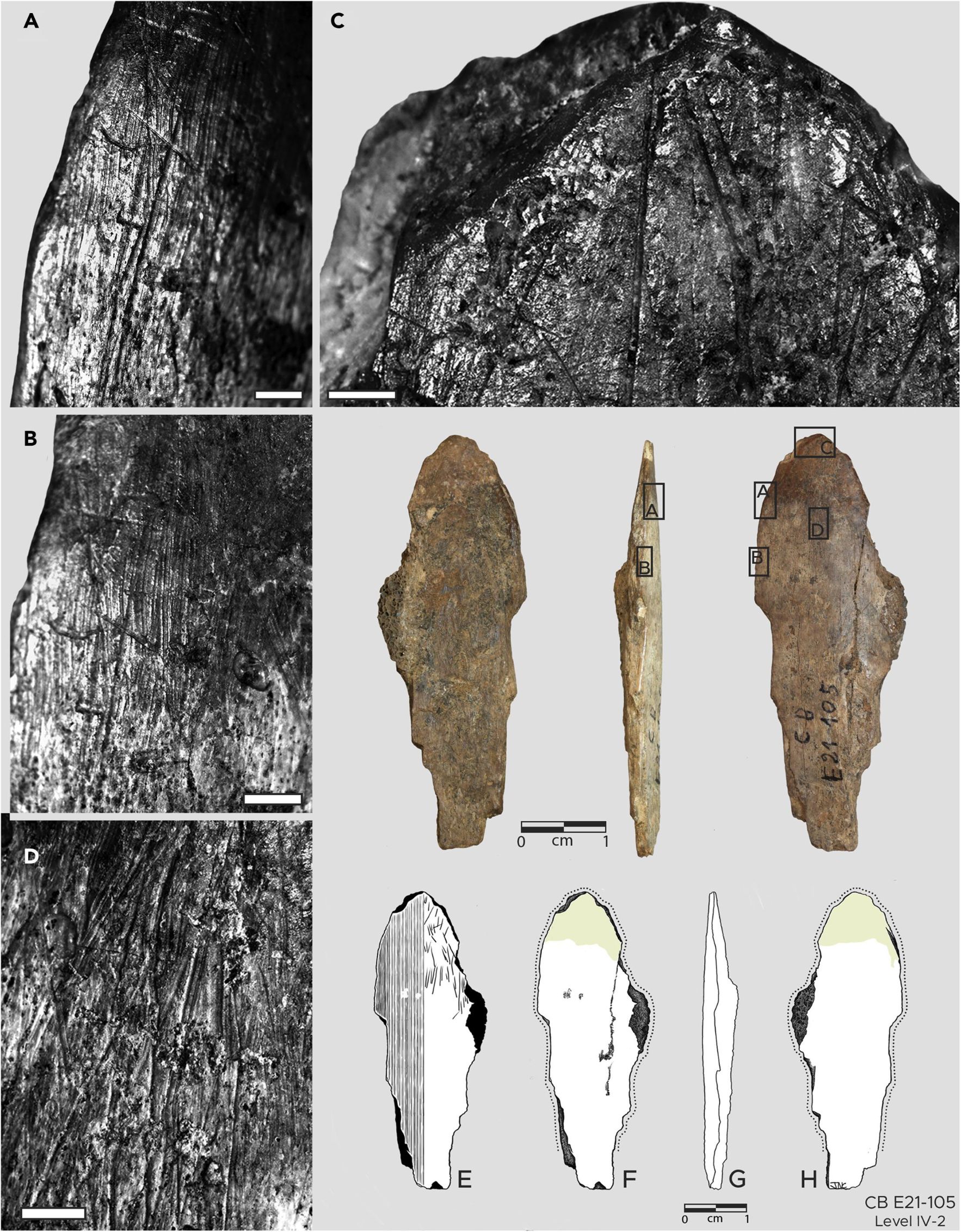 发现的骨质工具形状较规则,经历过打磨抛光,表面平整,表明使用了很长时间。专家在骨质工具旁边还发现了小型毛皮动物的骨骼,包括沙狐、金豺、野猫,上面的痕迹表明,古人类处理这些动物是为剥去毛皮。洞穴中出土的其他大型有角动物的骨骼则显示,古人类处理它们是为了吃肉。