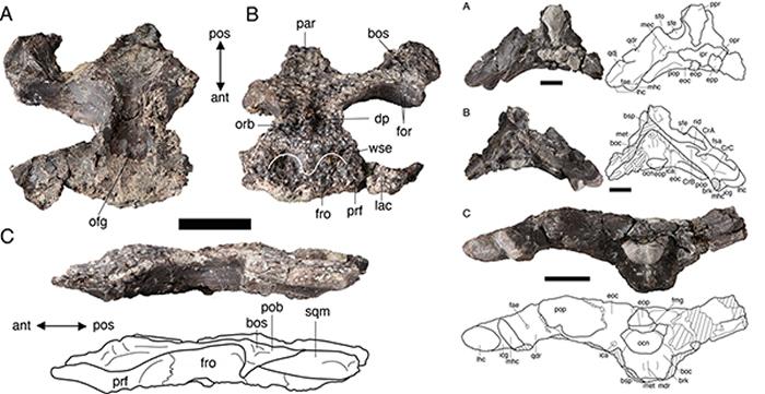 龙山延吉鳄Yanjisuchus longshanensis gen. et sp. nov.正型标本头骨及线条图 (Rummy et al., 2021)