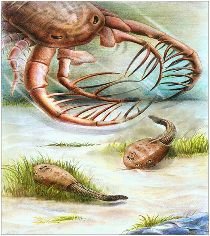 一只巨大混翅鲎准备捕食无颌类骨甲鱼(引自盖志琨、朱敏,2017,郭肖聪绘)