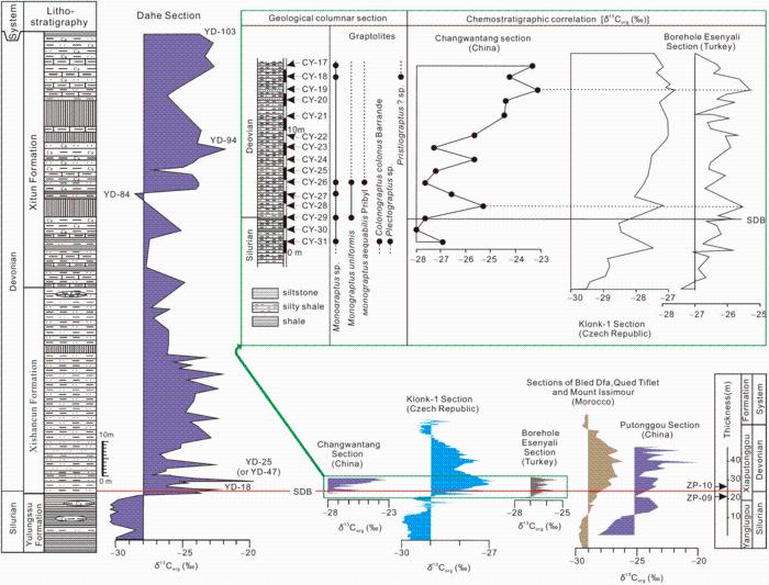 在宜良大河复合剖面上,玉龙寺组上部和西山村组下部的δ13Corg值有明显的正向偏移, 在西山村组最下部样品YD-25中显现δ13Corg的峰值(-20.0‰), 再现了全球志留系最上部至泥盆系最下部δ13Corg的变化趋势。根据大河复合剖面与捷克布拉格盆地靠近GSSP的Klonk-1钻孔剖面上δ13Corg变化的对比以及与土耳其、摩洛哥和中国的其他四条剖面的综合对比, 大河地区的SDB宜置于西山村组最下部,即样品YD-17与YD-18之间。(《中国科学》杂志社)