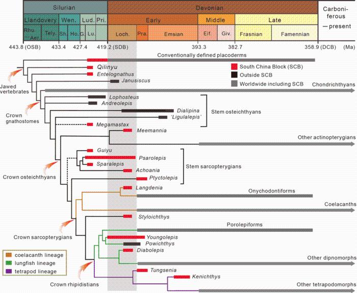 扇鳍鱼类冠群及肉鳍鱼类冠群最古老的代表肺鱼形类杨氏鱼(Youngolepis)主要生活于早泥盆世洛赫考夫期(419.2±3.2~410.8±2.8 Ma),肉鳍鱼类干群的斑鳞鱼(Psarolepis)、鬼鱼(Guiyu)则早在志留纪罗德洛世卢德福特期(425.6±0.9 Ma)已有报道。因此, 空棘鱼-扇鳍鱼和肺鱼-四足动物的分异均应发生在罗德洛世-洛赫考夫期间隔内,这意味着两个分歧点的最小估算时间至少应为416.0(419.2-3.2)Ma、最大估算时间约为426.5(425.6+0.9) Ma,即空棘鱼-扇鳍鱼与肺鱼-四足动物的分异均应发生在426.5~416.0 Ma之间。Artwork credit: Brian Choo and Yong Xu.(《中国科学》杂志社)