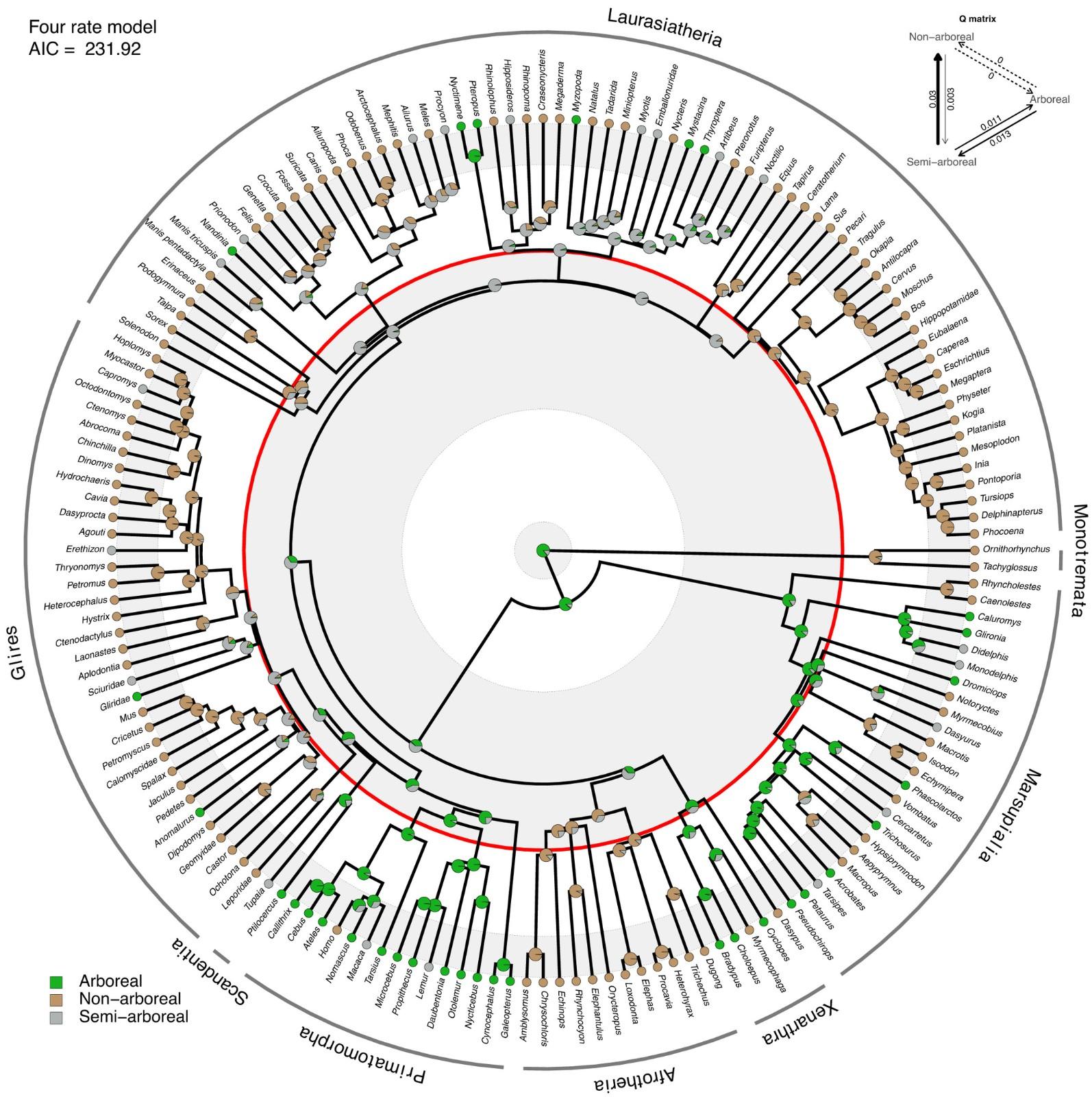 在这项研究中,研究人员使用了已发表的哺乳动物系统发育图(显示生物群体之间进化关系的树状分支图)。然后,他们根据这些系统发育将每一种活着的哺乳动物分为三类--树栖的、半树栖的和非树栖的--基于它们喜欢的栖息地。他们还设计了计算机模型,重建了哺乳动物的进化历史。