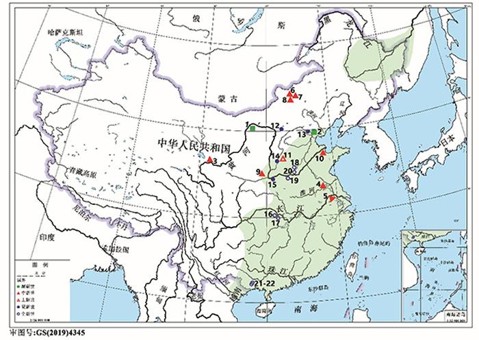 (图2)现代草鱼和草鱼咽喉齿化石分布图(序号1~22 表示类草鱼和草鱼咽喉齿化石的22个分布地点; 绿色阴影表示现代草鱼的天然分布区域)