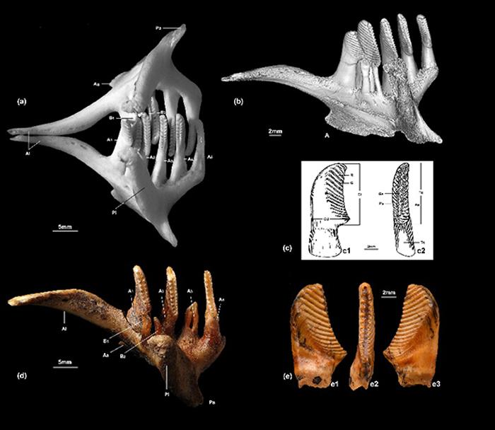 (图3)草鱼梳状咽喉齿(a) 成年草鱼Ctenopharyngodon idella (Cuvier和Valenciennes, 1844)的一对咽骨及其上的咽齿, 背侧视, 示原位咽齿, IVPP OV 2636, 前端向左; (b) 草鱼左侧咽骨及咽齿的3D显微断层扫描成像, 前侧视, 示两行咽齿, IVPP OV2636; (c) 一枚右侧主行咽齿的线条图, 示齿的构造, 分别为后视(c1)和背视(c2). 修改自张弥曼等(1985);(d) 大河村遗址出土的左侧咽喉骨具咽齿(A3除外), IVPP V 13714, 背视;(e) 左侧主行齿, IVPP V 2452, 前视(e1)、背视(e2)和后视(e3), 采自榆社.