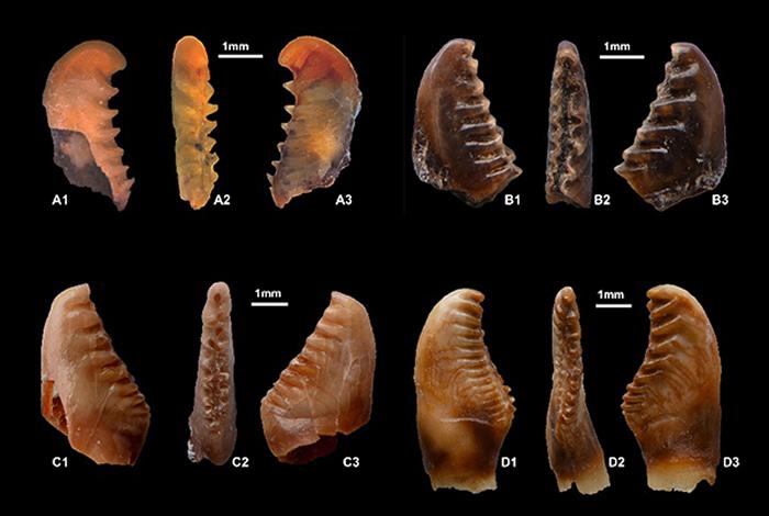 研究团队发现其中来自渐新世两个地点的咽喉齿化石分别代表了两个比较古老的绝灭属种,并建立了德造鱼属(Dezaoia)的三盛公德造鱼(Dezaoia saintjaquensis gen. et sp. nov.), 和始草鱼属(Eoctenopharyngodon)的刘氏始草鱼 (Eoctenopharyngodon liui gen. et sp. nov.) (图3A 和B)。内蒙古杭锦后旗三盛公下渐新统乌兰布拉格组的三盛公德造鱼,它的齿冠侧面的脊和沟比较短, 顶端上弯且增大,咀嚼面窄长且较直, 脊的末端尖使咀嚼面边缘呈锯齿状。这种锯齿状的咀嚼面边缘在幼年草鱼刚萌出齿中常见, 但在成年草鱼的咽齿中尚未发现过。始草鱼属的刘氏始草鱼采自河北安次上渐新统东营组,它的咽喉齿形态更接近于现生草鱼,但是齿较厚较短, 齿冠前后侧面脊的数目少而短, 咀嚼面外侧端似乎稍后转, 化石产自上渐新统,代表了似草鱼类的已绝灭的属种。