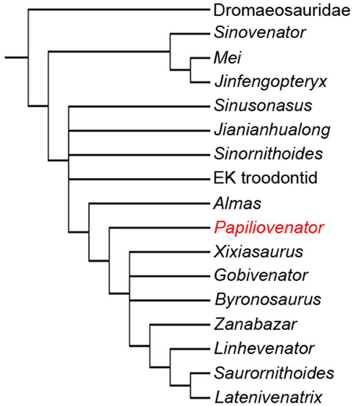 基于最简约原则的系统发育分析结果表明,目前发现所有的晚白垩世伤齿龙在伤齿龙科中构成一个较进步的单系类群,内蒙古蝶猎龙位于这个单系类群靠近基部的位置,仅比报道于蒙古国晚白垩世的阿尔马斯龙(Almas)要晚分异一些。阿尔马斯龙和蝶猎龙是已报道的晚白垩世伤齿龙科恐龙中仅有的短吻型代表,其头骨特征兼具更早期分异的早白垩世伤齿龙的基本轮廓和其它晚白垩世伤齿龙的细节骨骼特征。对比发现,戈壁盆地晚白垩世坎帕阶的伤齿龙在头部和前肢形态上有较大分异,表明这个时期有限地理区域内的伤齿龙在取食策略上可能已经展现出一定的差异性。内蒙古蝶猎龙的发现表明晚白垩世东北亚陆地生物群的多样性程度比之前认为的更高且更复杂,对理解近鸟类恐龙的演化模式以及东北亚晚白垩世的古生态和古环境历史具有重要意义。