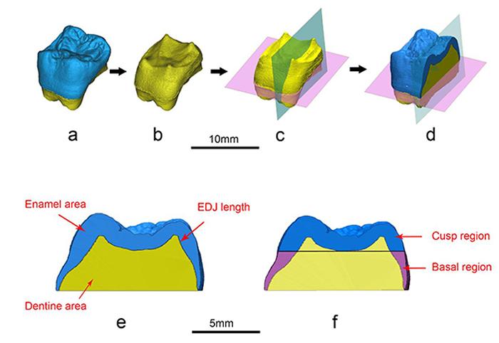 研究者通过显微CT重建牙齿虚拟模型,从中获得近中二维虚拟切面,在此虚拟切面上将釉质分布分为牙尖咬合部和牙侧基部,然后作定量测量和比较(图)。 研究发现,禄丰古猿臼齿釉质分布有明显的不均性,牙尖和咬合面釉质明显厚,这一特点明显区别于非洲大猿,后者釉质厚度分布相对比较均匀,猩猩介于二者之间。尽管禄丰古猿与猩猩具有相近的相对釉质厚度,但两者的釉质厚度分布特征有所不同。禄丰古猿釉质分布具有更大的不平衡性, 表现为更多的釉质集中于齿冠上部(牙尖区域),而齿冠下部(基部区域)的釉质较少。相比之下,禄丰古猿釉质厚度的分布特点与人类更相近,即咬合面和牙尖部釉质厚度明显增厚,牙尖部釉质体量占比高。这一结果提示二者牙齿釉质结构与功能具有趋同的适应性,其系统演化关系有待深入考证。