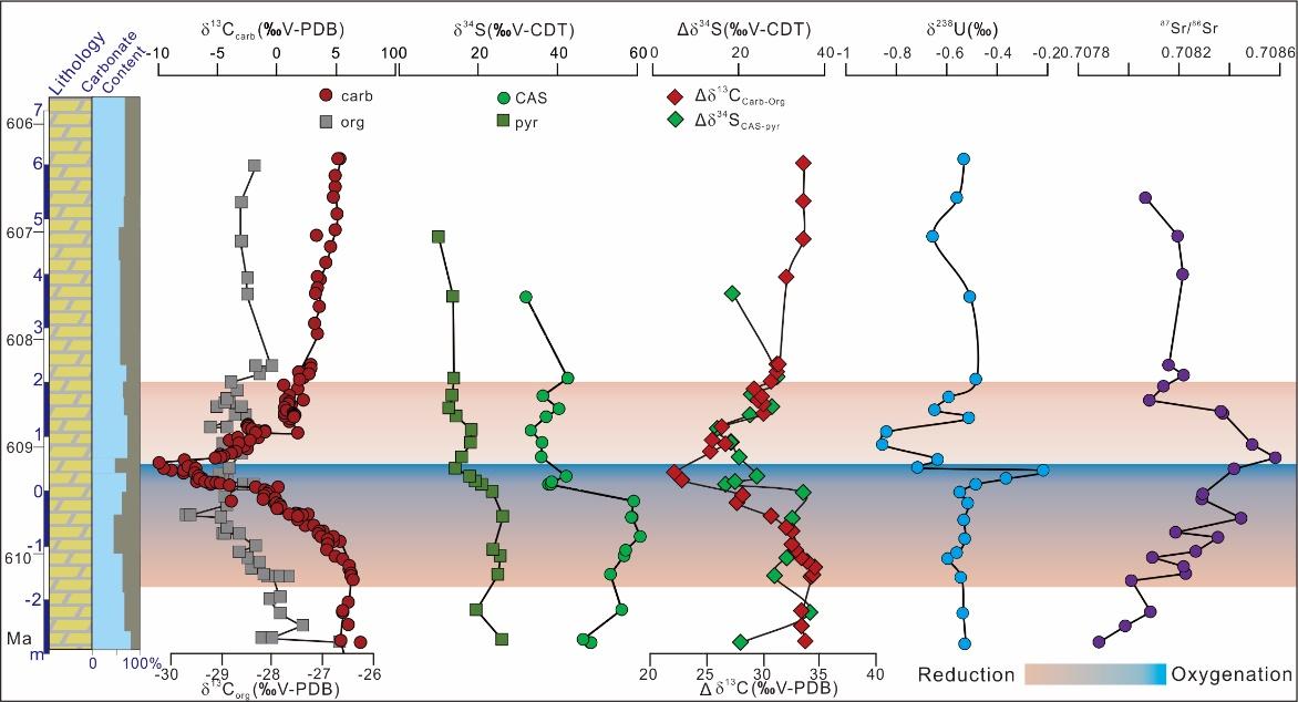 本次研究,该团队在三峡地区南坨村剖面埃迪卡拉纪陡山沱组Ⅱ段地层(约6.1亿年之前)中识别出一个与地质历史上全球最大的Shuram/DOUNCE事件(陡山沱负碳同位素负偏移事件)级别相同、但持续时间更短(~1.5 百万年)的碳同位素负偏移事件,相当于先前识别WANCE事件(瓮安负碳同位素偏移事件)。为了弄清这一负漂移事件发生原因,团队开展了详细的碳、氧、硫、铀、锶等多同位素体系分析,进而揭示了这次负漂移事件记录的是一次由大陆风化增强导致的硫酸盐输入增加所触发的短暂海洋氧化事件。