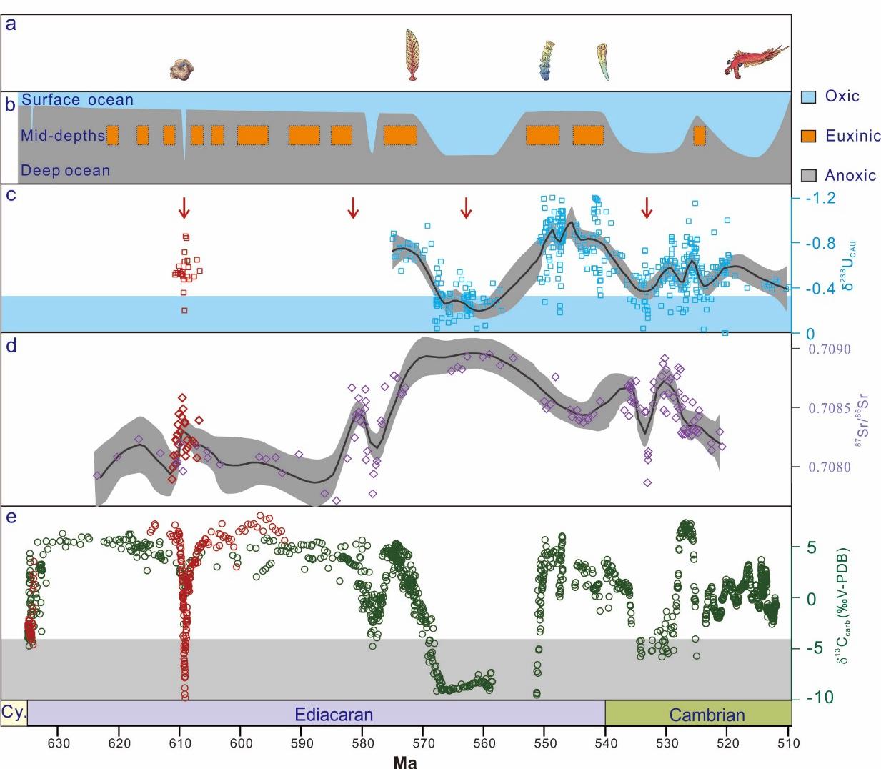 图2 埃迪卡拉纪重要的生物革新事件、海洋氧化还原状态以及铀、锶、碳同位素记录