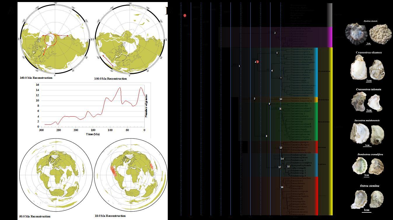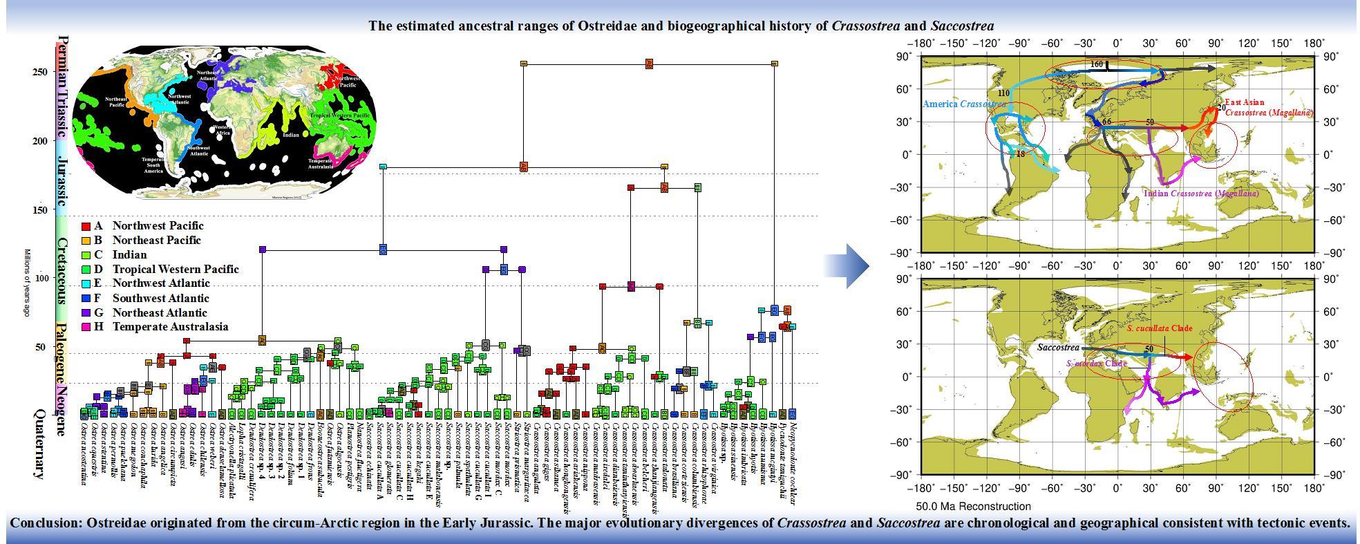 分化时间及生物地理重建结果表明,牡蛎科起源于早侏罗纪(约180百万年前)环北极地区,之后经历4次较大规模生物多样性中心的转移和物种更替,最终形成当前的分布状态。晚侏罗纪-早白垩纪(约180-100百万年前)环北极区域为当时牡蛎物种起源、保存和扩散的重要区域。此时,环北极区域各大陆的连通与隔离,以及北大西洋的扩张促进了牡蛎各亚科的形成。白垩纪晚期(约100-66百万年前)北大西洋东西两岸为牡蛎多样性热点区域,之后向特提斯海转移。第三纪(约66-23百万年前)特提斯海的缩小促进了牡蛎主要支系的分化,特别是巨蛎属(Crassostrea),主要支系分化的时间地点与地质事件发生的时间和地点相吻合。自印度与欧亚大陆板块相撞之后(约45百万年前),西太平洋热带海域逐步演变为现生牡蛎的物种多样性中心之一,特别是中新世(约23百万年前)以来,为牡蛎物种的保存发挥重要作用。