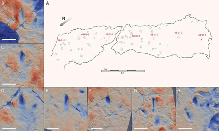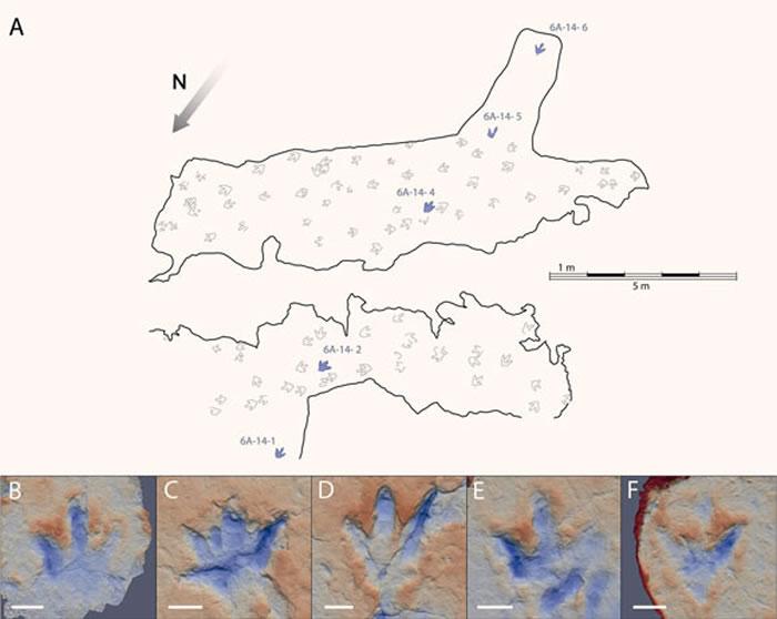 根据这些足印的角度和距离,研究人员计算出留下6A-14行迹的兽脚类恐龙能以23.4—37.1公里/时的速度奔跑,而留下6B-1行迹的兽脚类恐龙能以31.7—44.6公里/时的更快速度奔跑。这一速度在基于兽脚类足印估算的奔跑速度中可排前三。