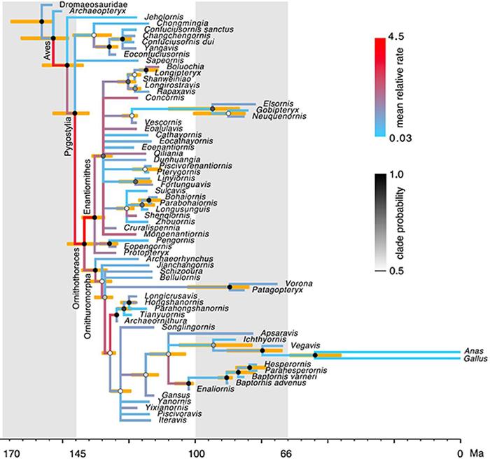 贝叶斯支端定年分析得到的中生代鸟类的时间树和特征演化速率