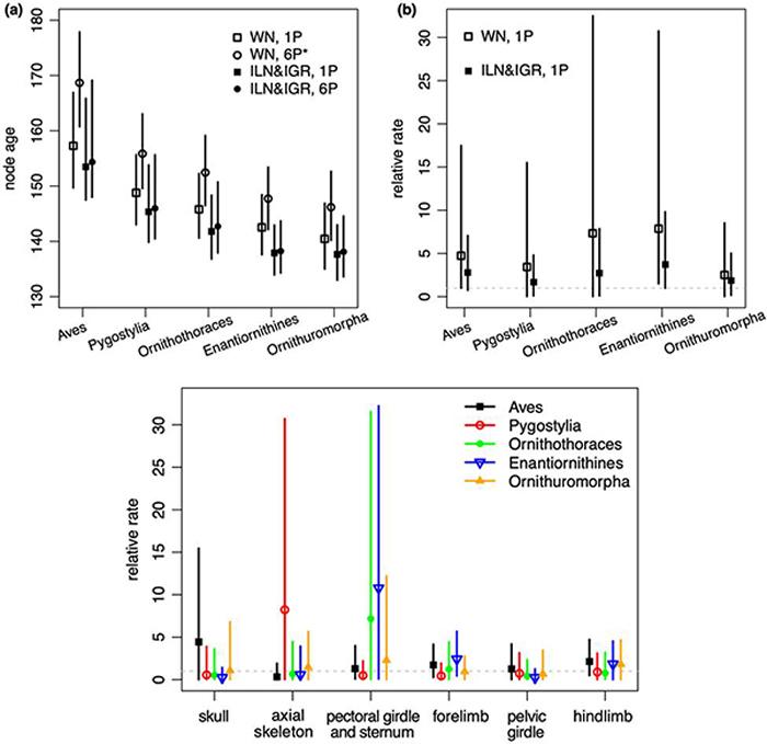 本研究首先通过计算机模拟来验证新的rjMCMC算法能够正确工作。随后,该rjMCMC算法被用于分析中生代鸟类的形态特征矩阵,运用贝叶斯支端定年法估计分异时间和演化速率 (图1)。和先前使用WN模型的分析 (Zhang and Wang 2019) 相比,平均化ILN和IGR模型能够提高分异时间和演化速率的估计精度。模型比较的结果表明,ILN模型比IGR模型更适配数据 (后验概率Pr[ILN] = 0.6),并远优于ALN模型。进一步地,通过对特征矩阵按照不同骨骼部位进行分区,该分模块的模型平均方法得到和未分模块的分析一致的分异时间估计,一致性好于使用WN模型的结果 (图2)。其中,ILN模型最适配肩带和胸骨特征 (Pr[ILN] = 0.98),而IGR模型最适配后肢特征 (Pr[IGR] = 0.83)。这些结果是对先前分析的完善和改进,其生物学意义仍遵从前篇文章,即鸟类在演化早期形态特征经历了快速的变化,这些变化和鸟类飞行能力的产生和完善密切相关。