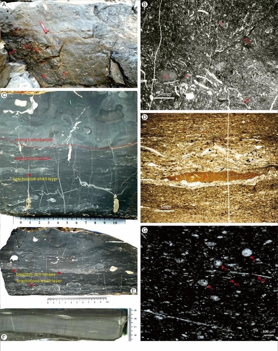 上寺剖面吴家坪组顶部(A, B)和大隆组底部(C-G)岩相和微相及风暴沉积(A, C-E)
