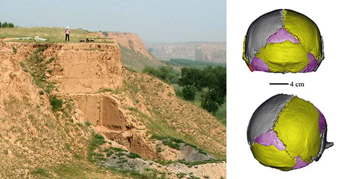 图1. 许家窑人遗址(左)及其发现的古人类化石复原头骨(右)
