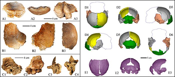 图2. 许家窑人头骨化石碎片及其复原的头骨和颅内模(吴秀杰供图)