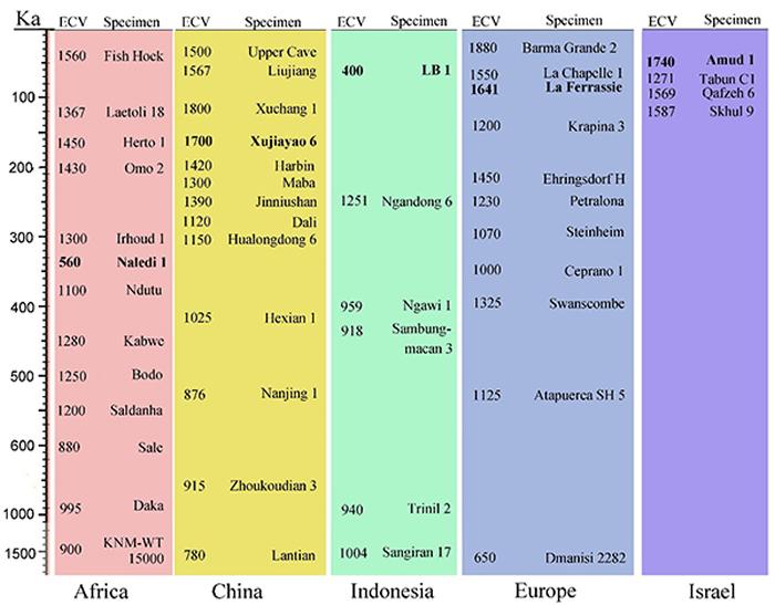 通常认为,更新世古人类的脑容量随着地质年代增大。比如,南方古猿的脑容量为404—530毫升,能人的脑容量为510—752毫升,直立人的脑容量为600—1251毫升,中更新世古老型智人的脑容量为1100—1450毫升,到了晚更新世早期的早期现代人以及尼安德特人的脑容量则增大到大于1500毫升。