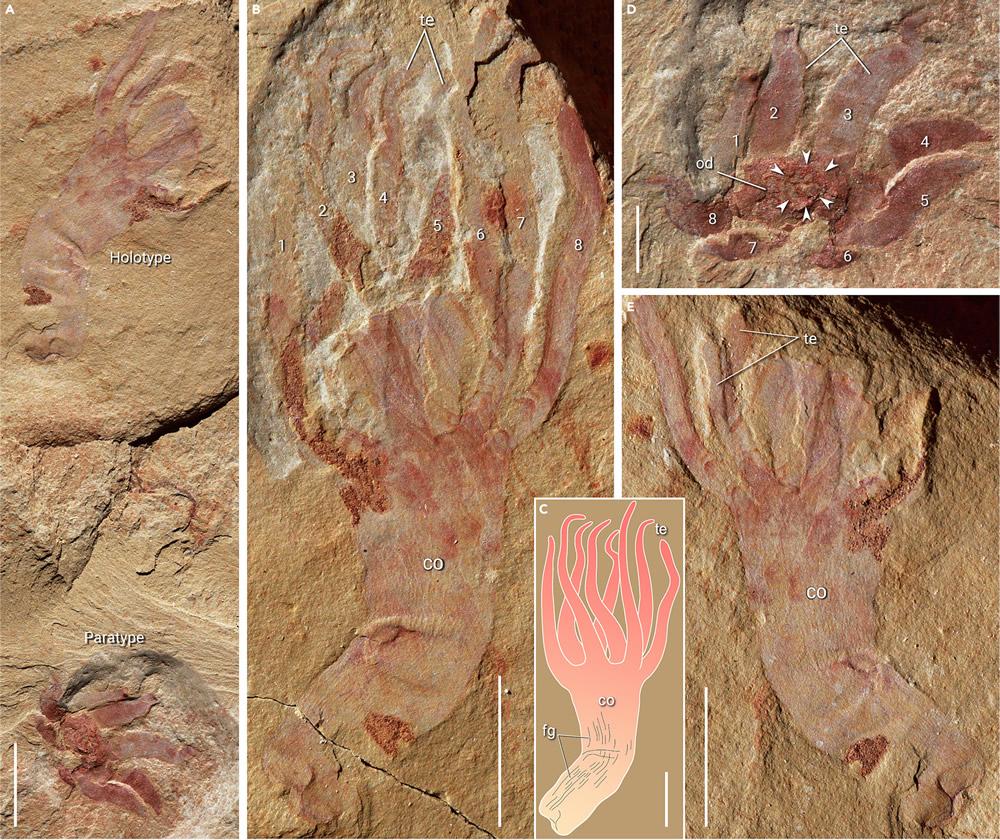 欧强介绍,该属种的整体形态接近现代海葵,其顶部边缘有8条修长、光滑的触手,环绕着中央的口部;圆柱状躯体内部有原始的消化循环腔;躯干表面纵纹指示了内部隔膜的存在。
