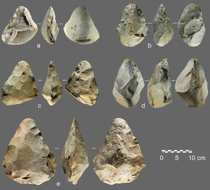 百色盆地发现的部分手斧标本。a-d以砾石为毛坯,e以大石片为毛坯;a为单面加工,b-e为两面加工。