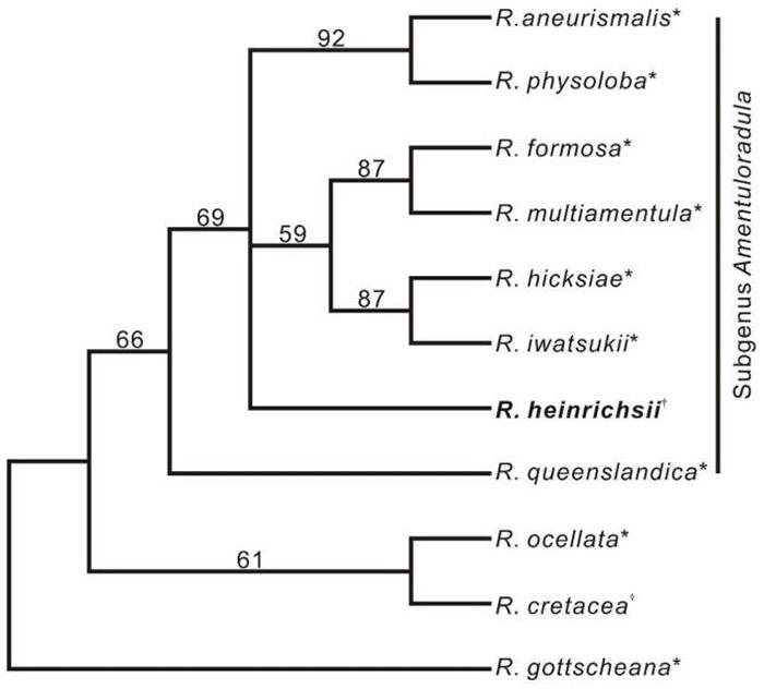 亨氏扁萼苔(Radula heinrichsii)及相关类群的系统发育树