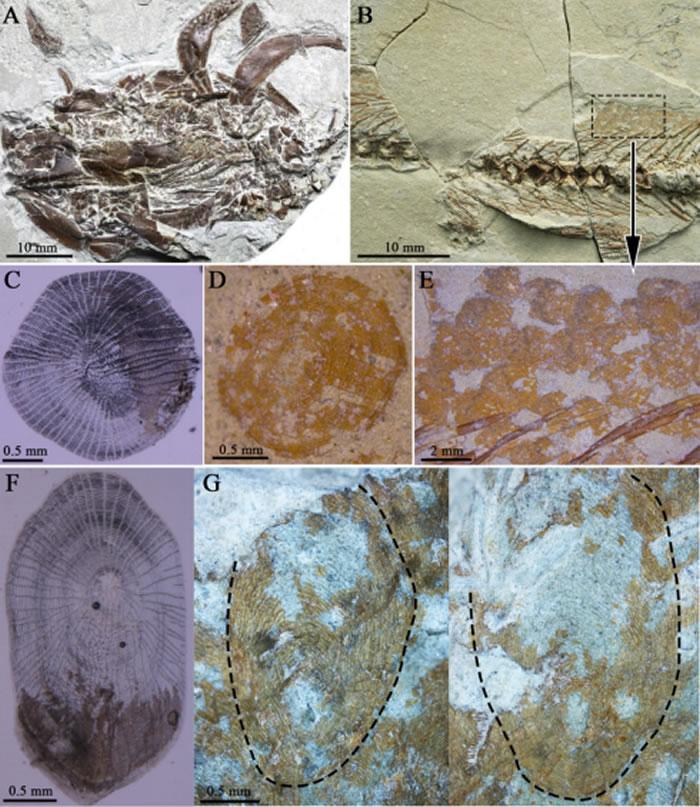 A,曙光古裂腹鱼头骨标本;B,保存有鳞片的副型标本;C、D,现代原始裂腹鱼与化石体鳞;E,图B中鳞片区域的放大;F、G,现代原始裂腹鱼与化石臀鳞