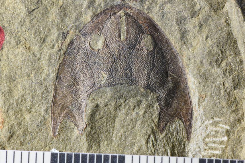 陈阳介绍,滨海涌洞鱼是一种盔甲鱼类,是东亚地区特有的无颌类脊椎动物。“头盔”其实是滨海涌洞鱼头部的外骨骼,是它最重要的自我保护“装备”。