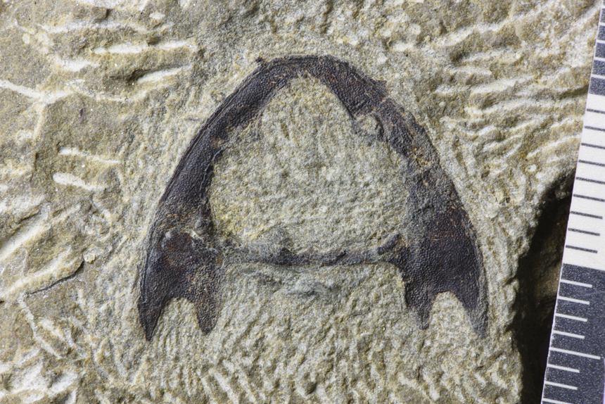 在重庆地质矿产研究院研究人员带来的几块巴掌大的岩石上,有形似半圆状的印迹,长约1.5厘米,上面两只眼睛、中背孔以及部分中横联络管的脉络也清晰可见。