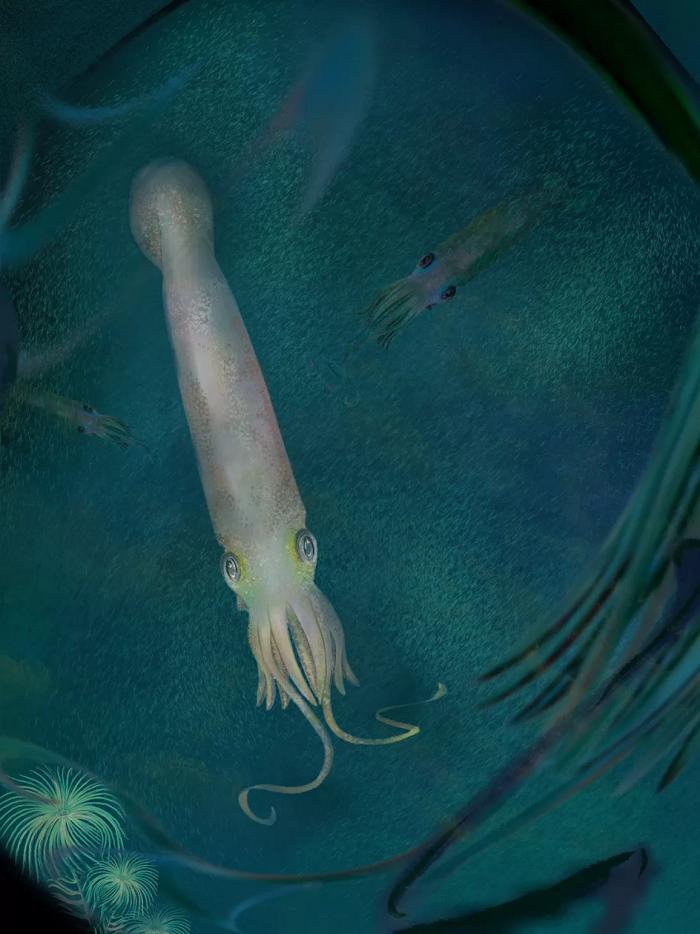 但总体来说,研究小组认为,Syllipsimopodi bideni看起来很像我们现在观察到的游动着的乌贼,它有着一个标志性的保龄球头、两只凸起的眼睛和一堆十几厘米的触手。
