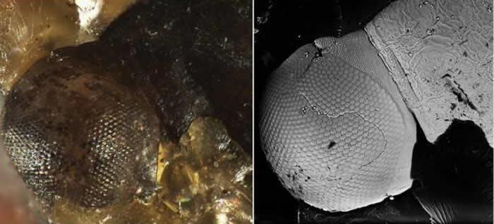 琥珀化石中钙化的昆虫眼睛结构。左为显微镜图像,右为电镜图像。中科院南京地质古生物研究所供图