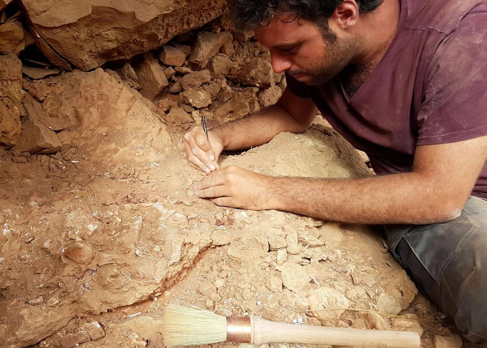 Matteo Fabbri在摩洛哥的骨骼遗址挖掘富含棘龙骨骼的碎片。Fabbri和同事后来从这堆骨头碎片中找到了棘龙的部分头骨。摄影:DIEGO MATTARELLI