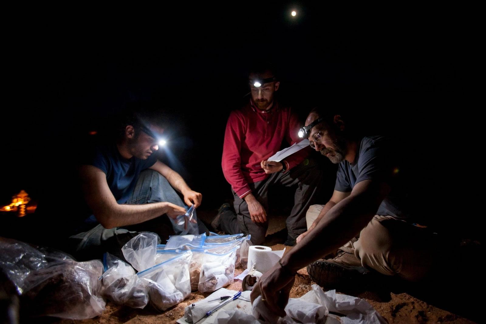 在国家地理探险家Nizar Ibrahim领导的勘察任务中,Fabbri(左)和同事Simone Maganuco(中)以及Davide Bonadonna(右)正在将摩洛哥棘龙遗址当天的发现编入目录。摄影:NANNI FONTANA